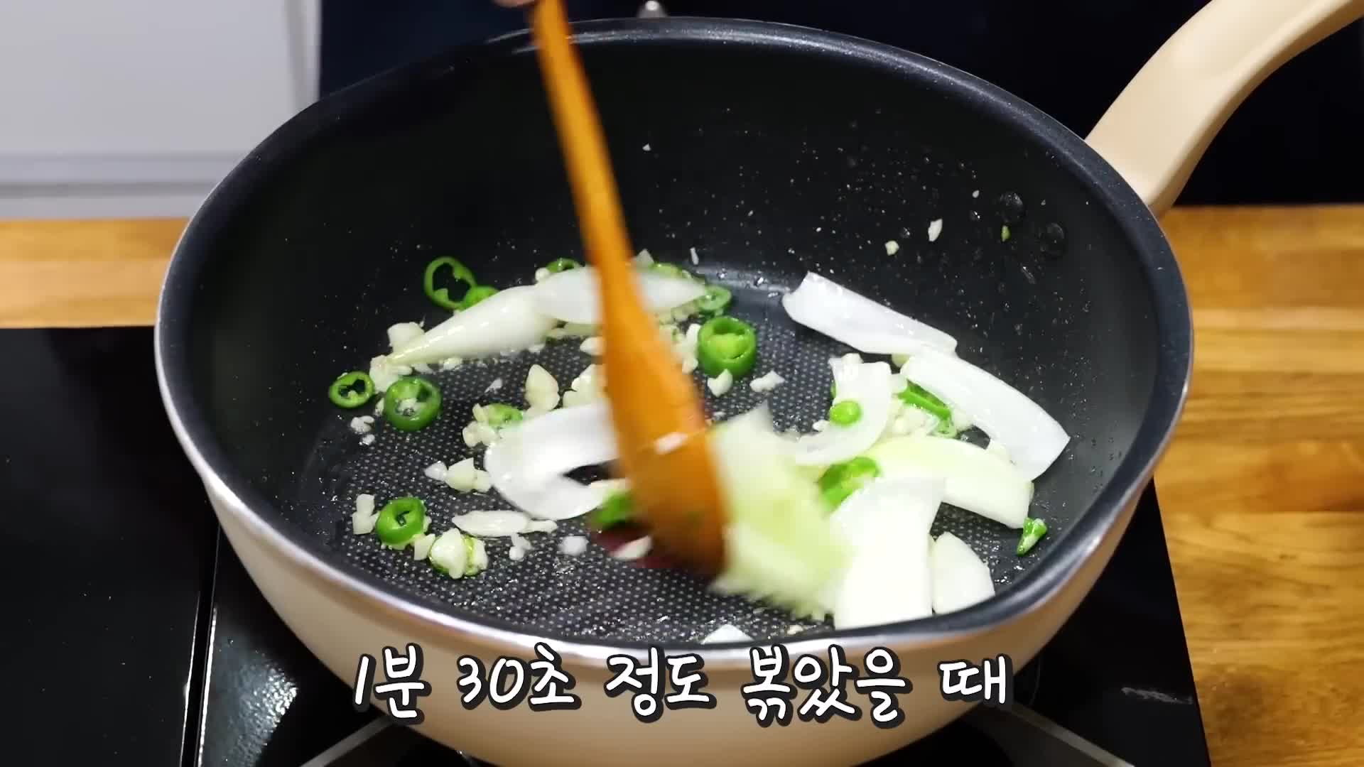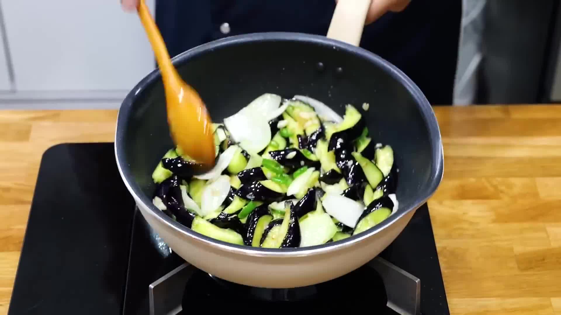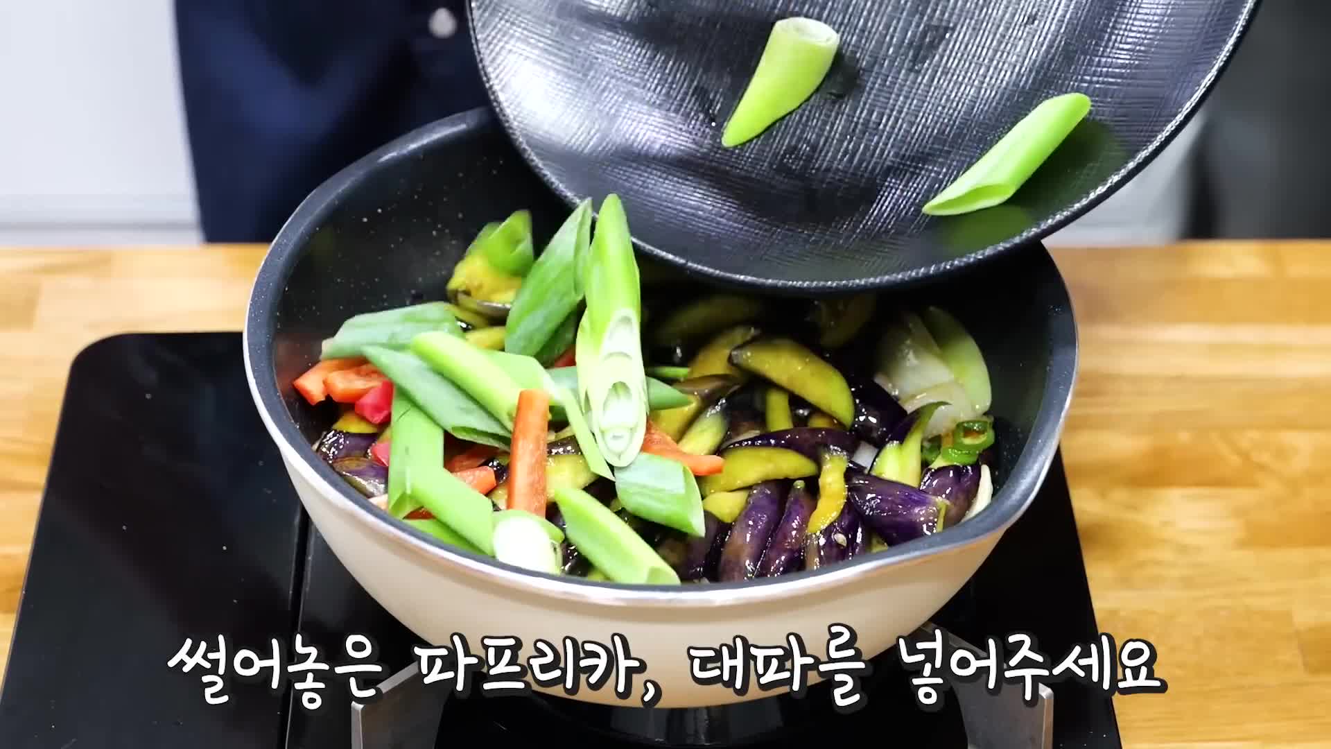 - 팬에 식용유를 두르고 마늘, 가지, 양파, 고추 순서로 볶는다.