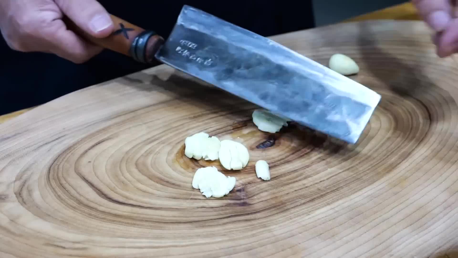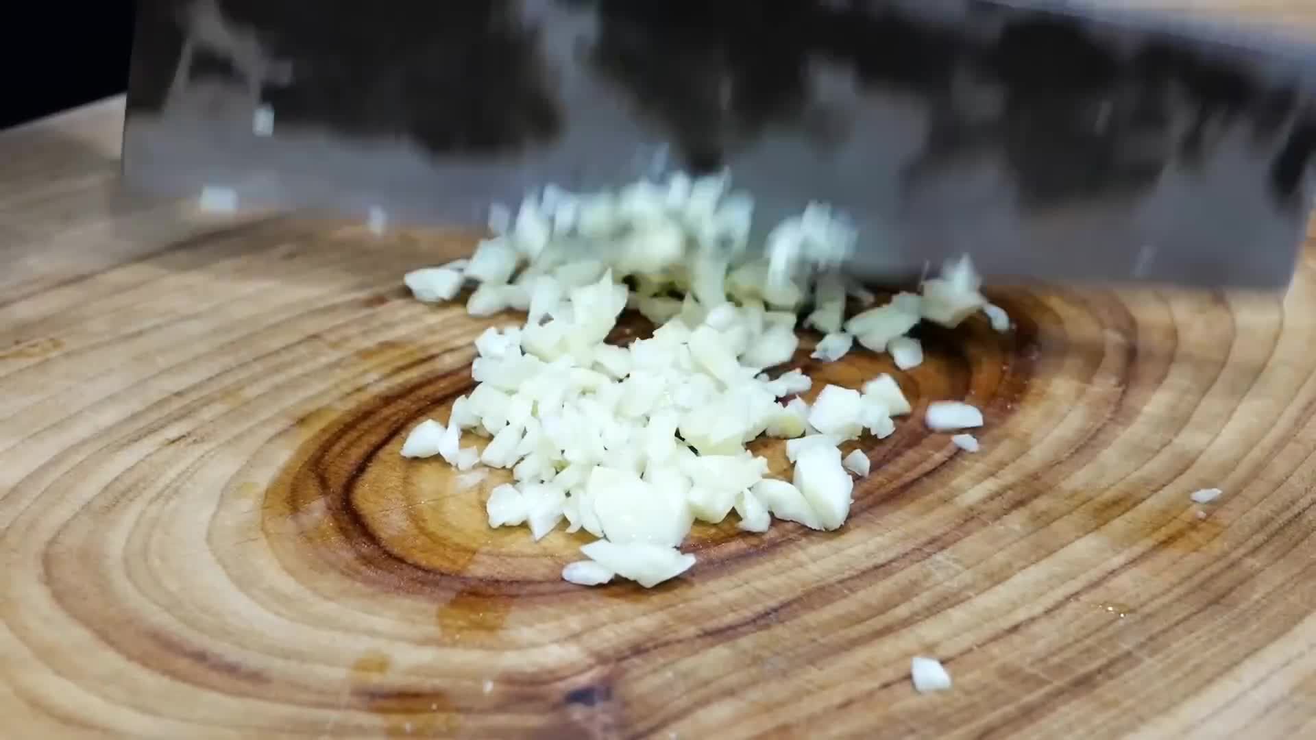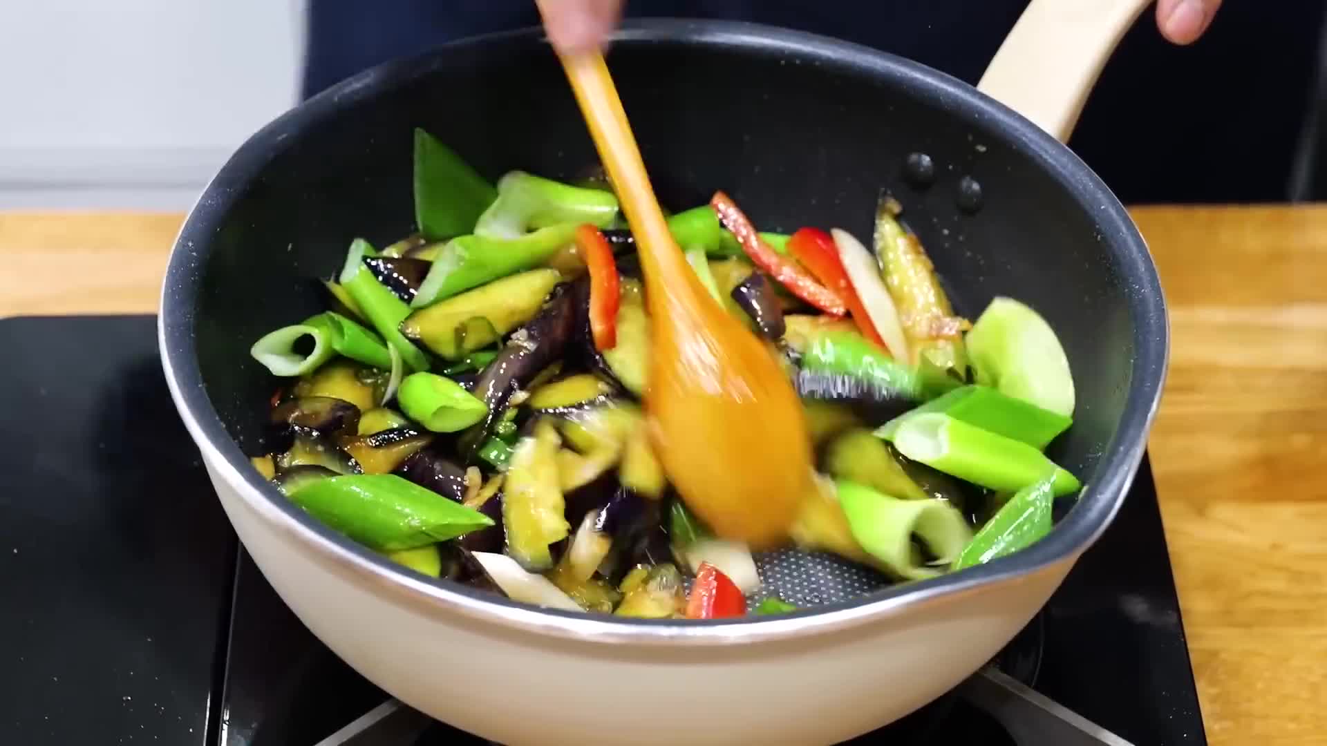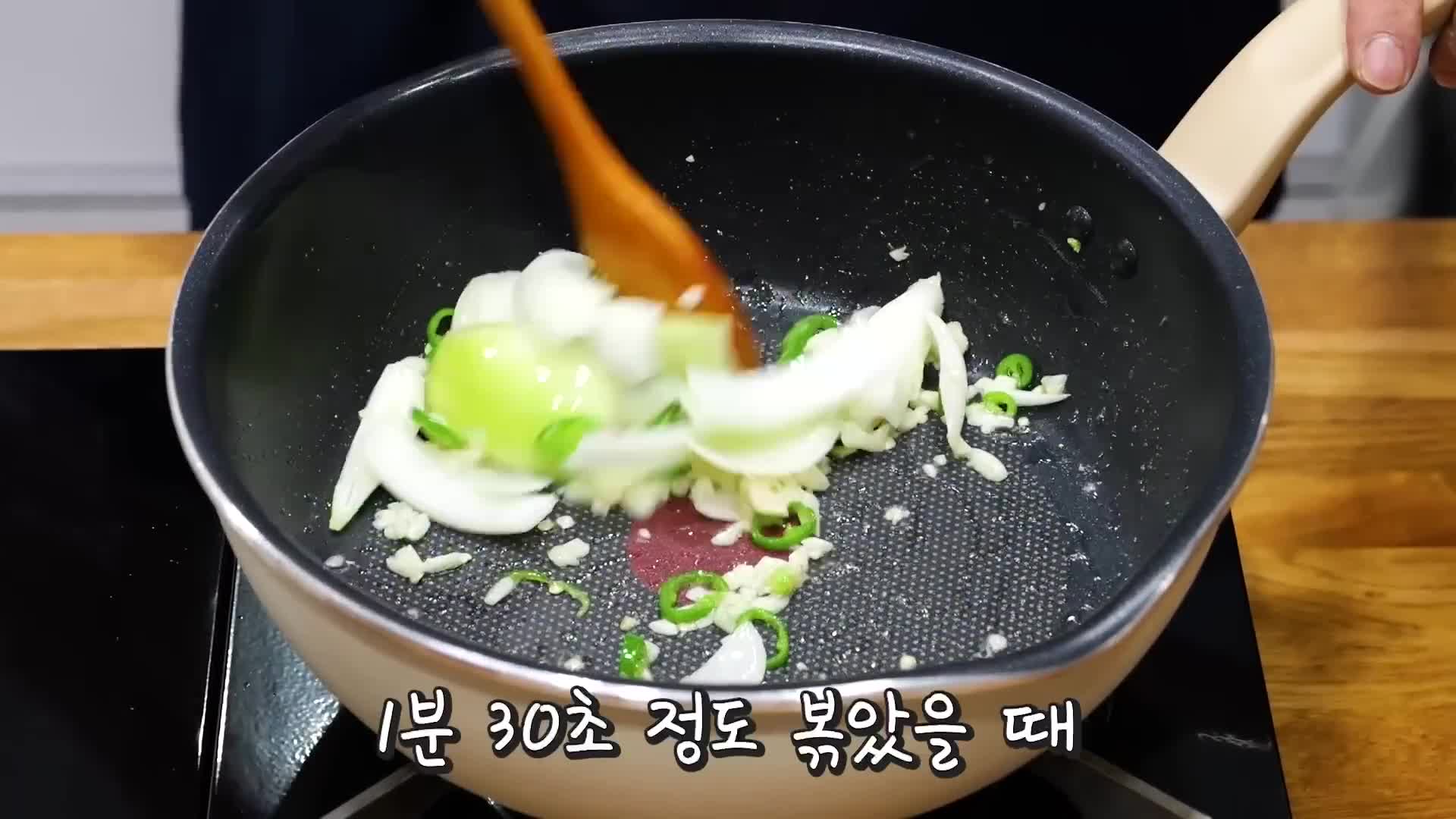 - 팬에 식용유를 두르고 마늘, 가지, 양파, 고추 순서로 볶는다.