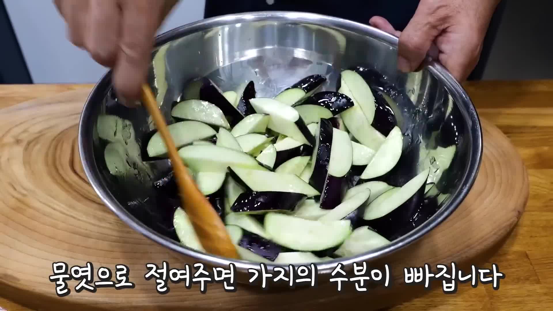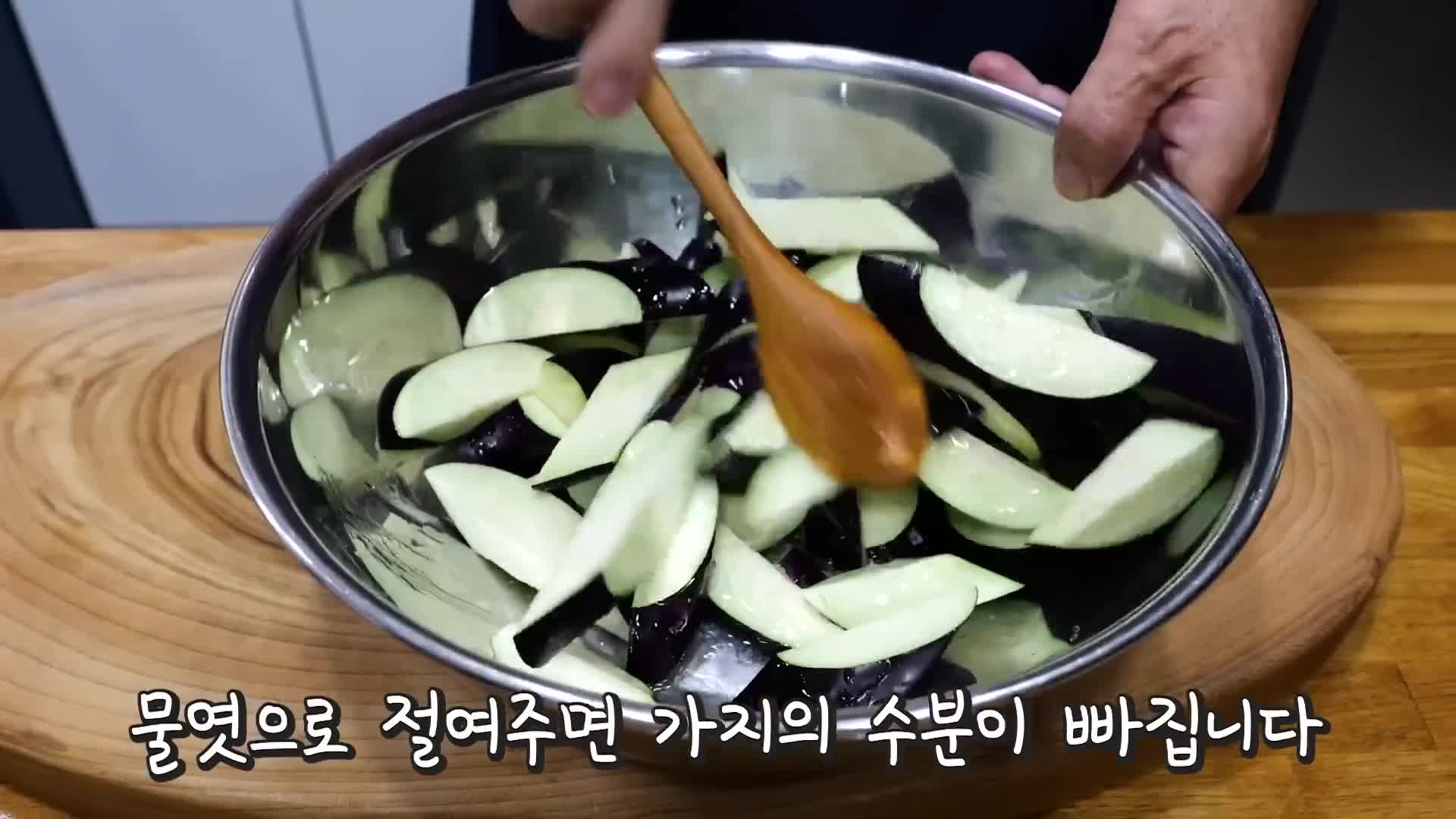- 가지는 통으로 삶아 반 갈라 소금에 절인다.